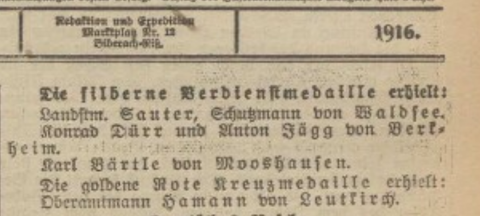 - Traueranzeige der Ehefrau Agathe und den Angehörigen vom 15. Juni 1940. (Vereinigten Bodenseezeitung (Verbo, Biberach) vom 15. Juni 1940, S. 8)