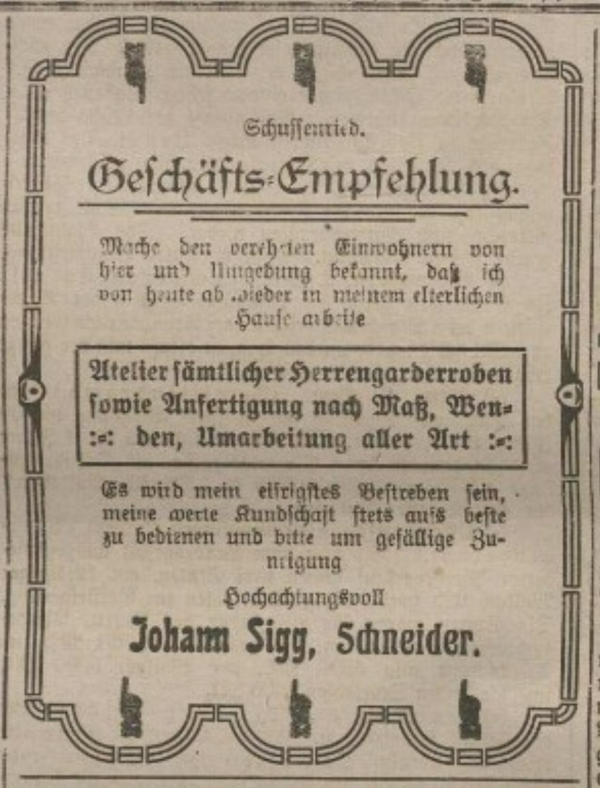 Am 11. August 1914 hat Ida Aßfalg geb. Rothmann den Lokomotivheizer Johann Georg Aßfalg aus Aulendorf geheiratet. Der Beruf von Ida Aßfalg bei der Heirat war Näherin.