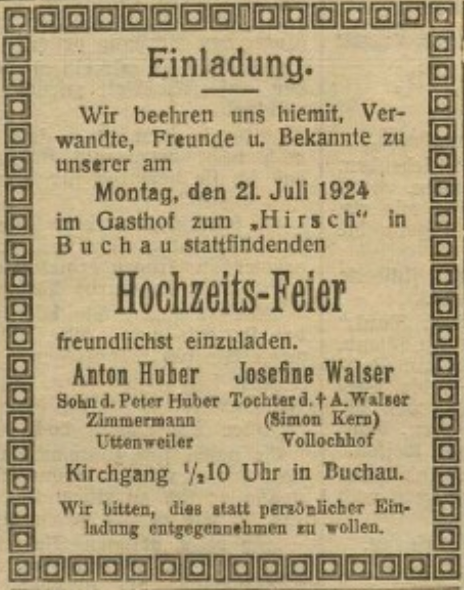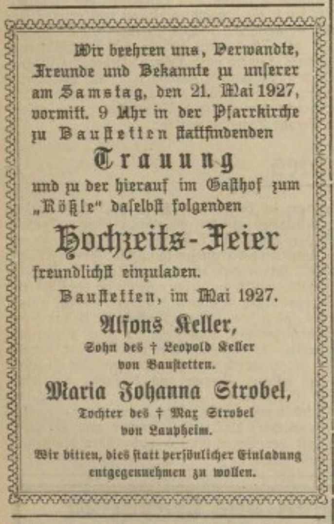 – Standesamtsnachrichten in Verbo Schussen-Bote : Oberschw. Morgenblatt, Ausgabe vom 9. Juni 1927, Seite 8.