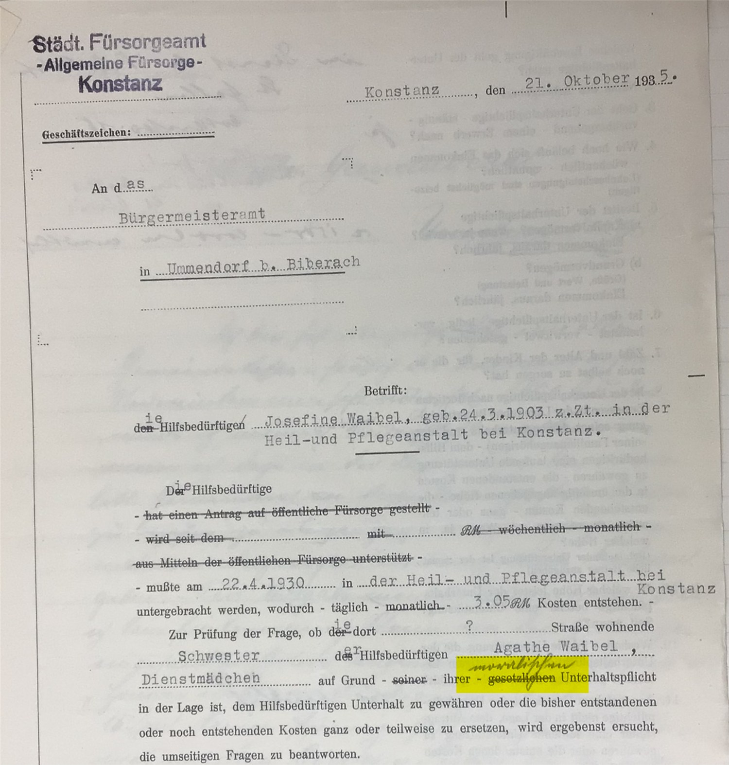 Im Gemeindearchiv Ummendorf gibt es noch eine Akte „Einzelne Fürsorgefälle“, darin sind mehrere Schreiben vor allem in Bezug auf die Verpflegungskosten für Josefine Waibel. Die Ortskrankenkasse hat die ersten sechs Monate die Kosten getragen. Danach hat die Anstalt bei der Gemeinde Ummendorf angefragt ob diese die Kosten tragen wird. Die Gemeinde hat das abgelehnt, da der Fürsorgeverband des letzten Aufenthaltsortes dafür zuständig ist, in diesem Fall Konstanz. Im Jahr 1935 gibt es noch einen Briefwechsel, das Städt. Fürsorgeamt Konstanz versucht bei der Schwester Agathe Waibel Geld für die Kosten zu erhalten, Begründung: „moralische Verpflichtung“.