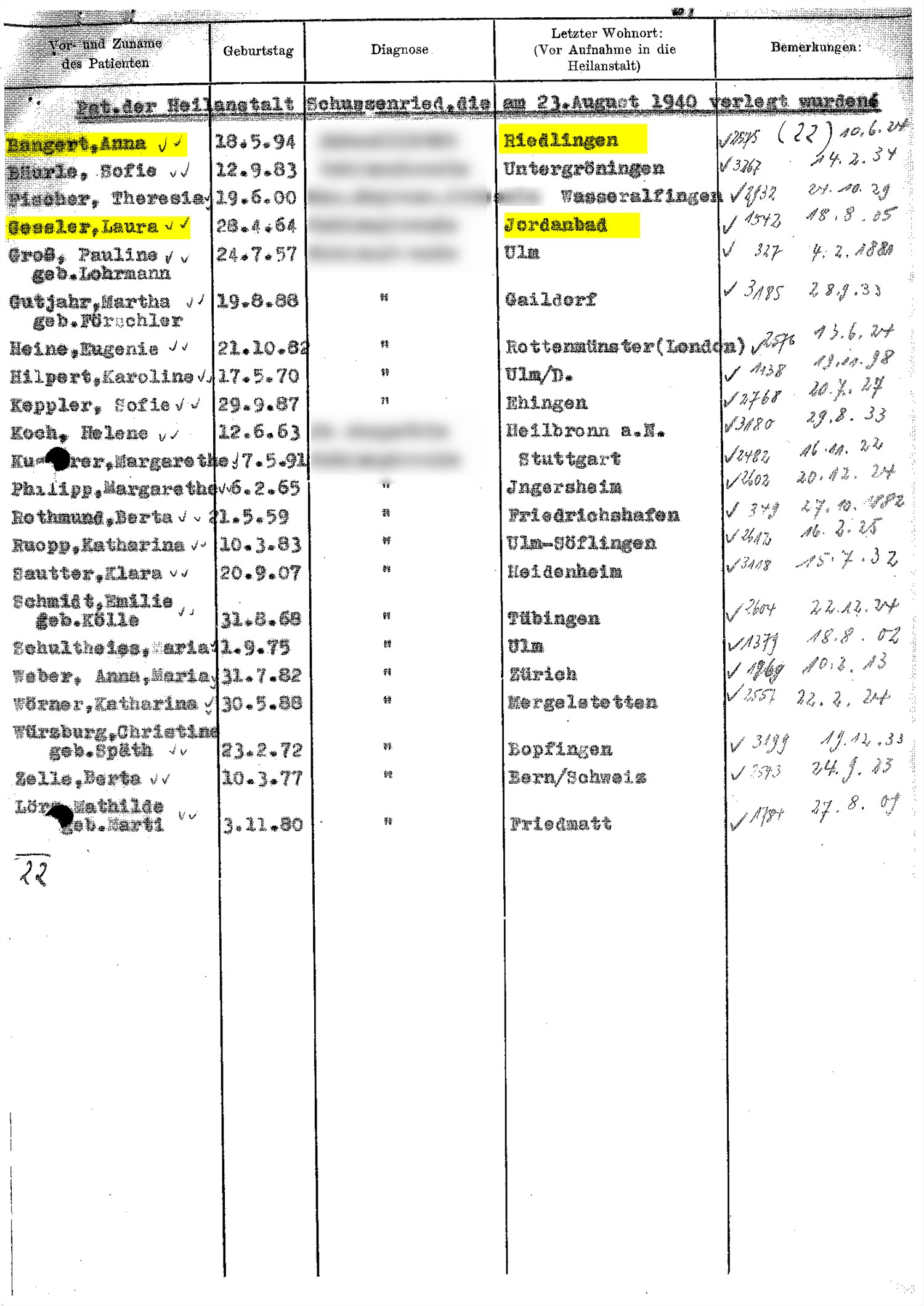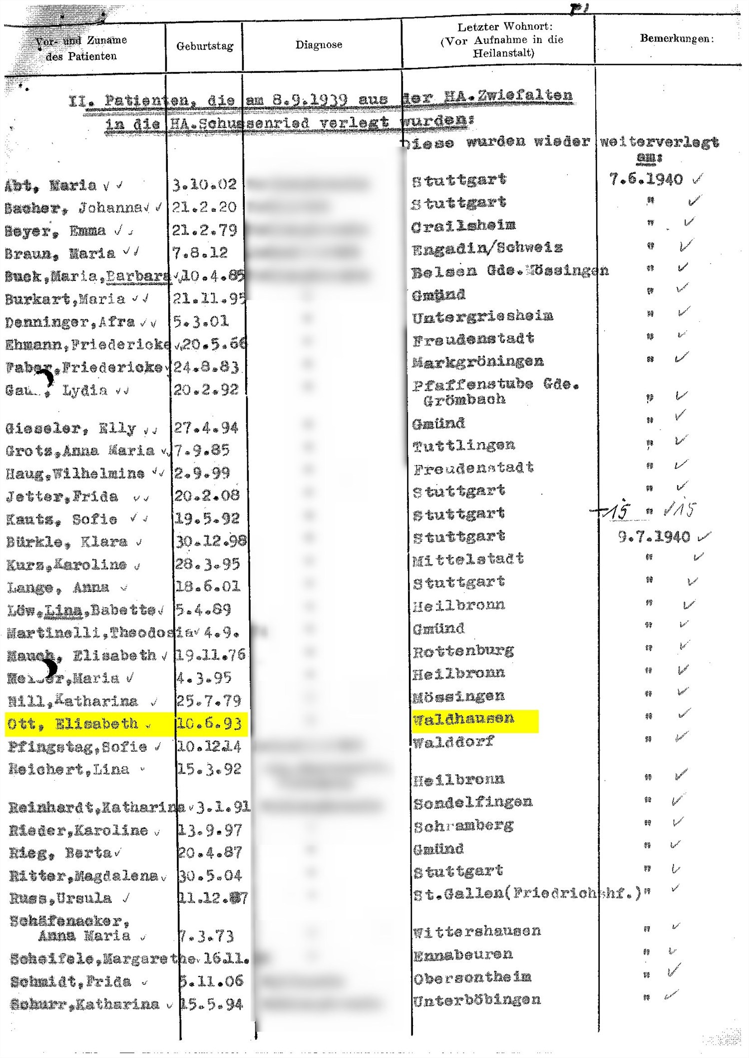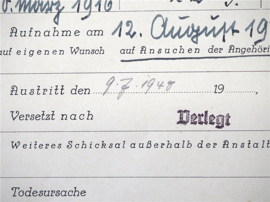 Datum der Deportation: 30. August 1940 Zwischenanstalt Zwiefalten