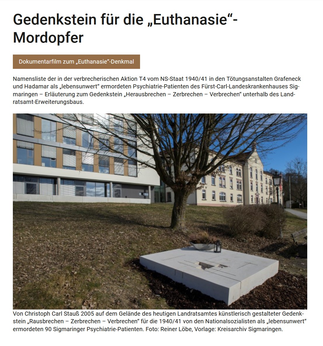 - Gedenkstein für Opfer des Fürst-Carl-Landeskrankenhauses Sigmaringen (Gedenkseite beim Landkreis Sigmaringen).