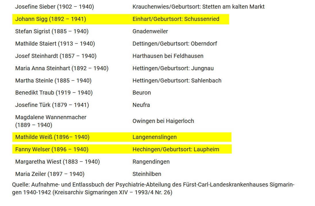 - Aufnahme- und Entlassbuch der Psychiatrie-Abteilung des Fürst-Carl-Landeskrankenhauses Sigmaringen 1940-1942 (Kreisarchiv Sigmaringen XIV – 1993/4 Nr. 26).