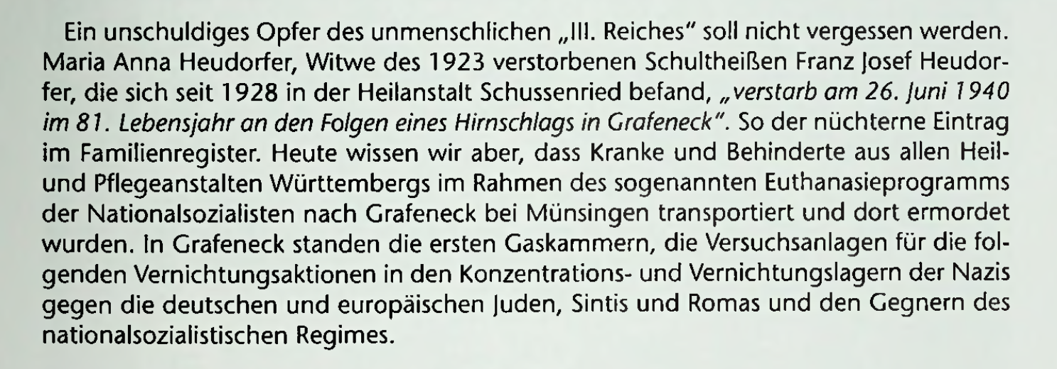 „Dass Wilhelm Wiedenmann vom Josenhof bei Eberhardzell auch in Grafeneck in der Gaskammer starb, ist in der Familie Wiedenmann/Denzel durchaus bekannt. Nach Erhalt der Todesnachricht aus Grafeneck schrieb die Mutter an die Heil- und Pflegeanstalt Liebenau ‚…Angegeben wurde Grippe mit Hirnhautentzündung. Der Tod sei für ihn eine Erlösung gewesen. Die Leiche wurde verbrannt. Die Asche wollen wir nicht holen. Die Leiche hätten wir geholt….‘. An den Formulierungen ist zu erkennen, dass die Mutter diesen Aussagen nicht geglaubt hatte, aber vorsichtig formulieren wollte, um nicht mit dem Regime Schwierigkeiten zu bekommen. Pfarrer Häring schrieb zu Wilhelm Wiedenmanns Tod in seiner nichtöffentlichen Pfarrchronik: ‚Ein Opfer des ‚Nationalsozialismus‘.“
