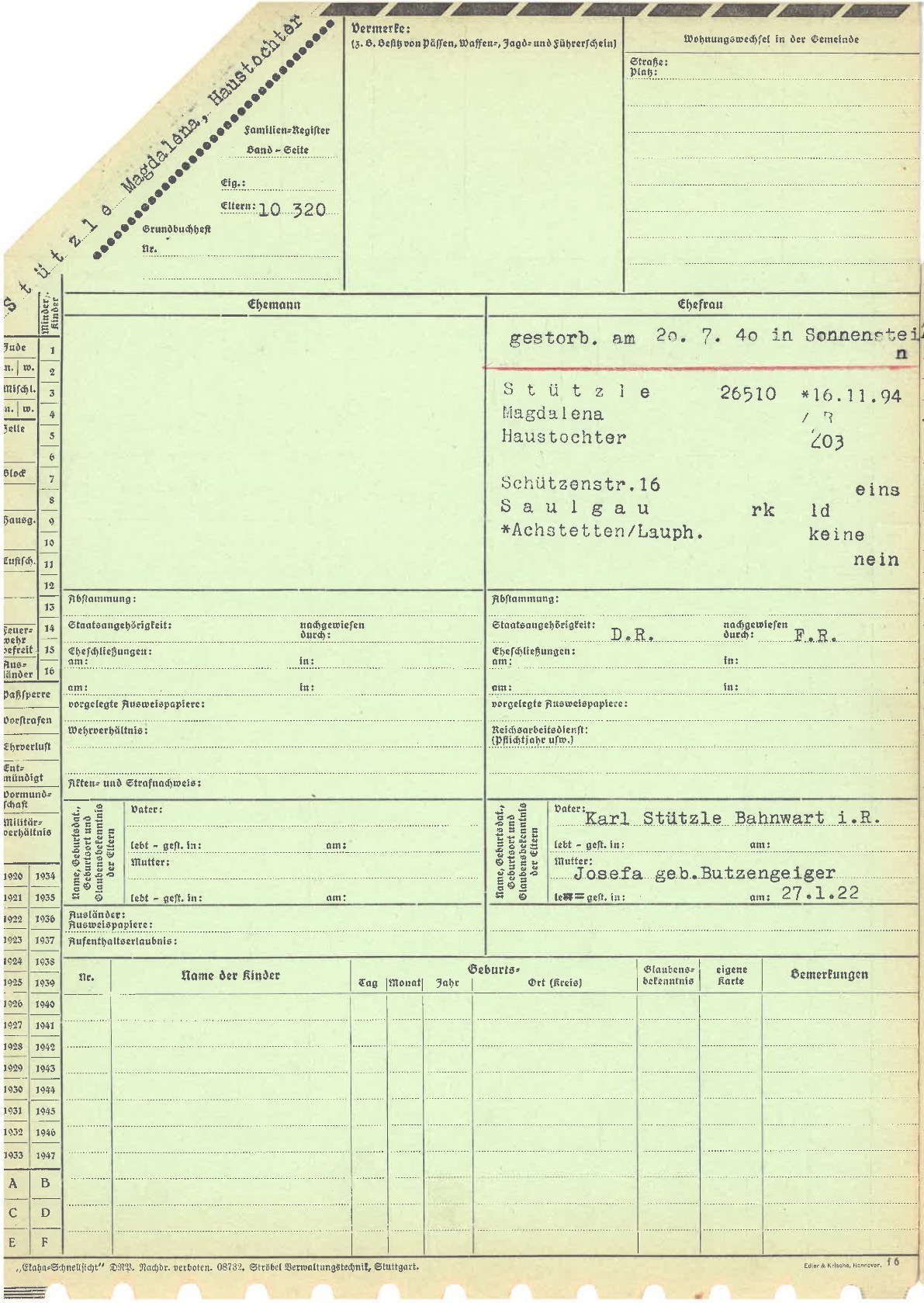 Das gemeldete aber gefälschte Sterbedatum ist im Familienregister der Eltern verzeichnet, es ist der 08. Juli 1940.