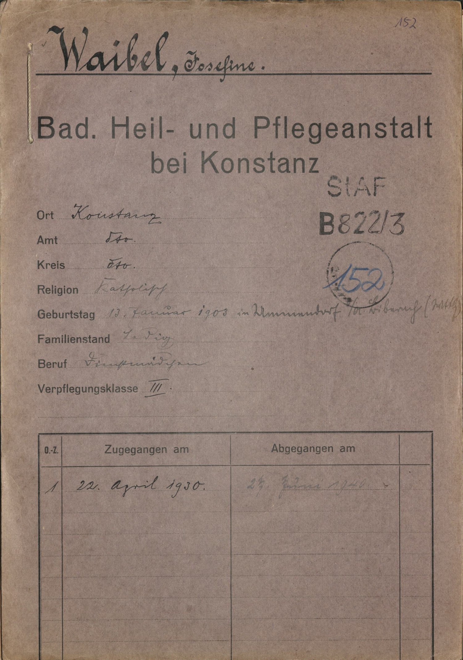 - Landesarchiv Baden-Württemberg, Staatsarchiv Freiburg B 822/3 Nr. 152 Waibel, Josefine.