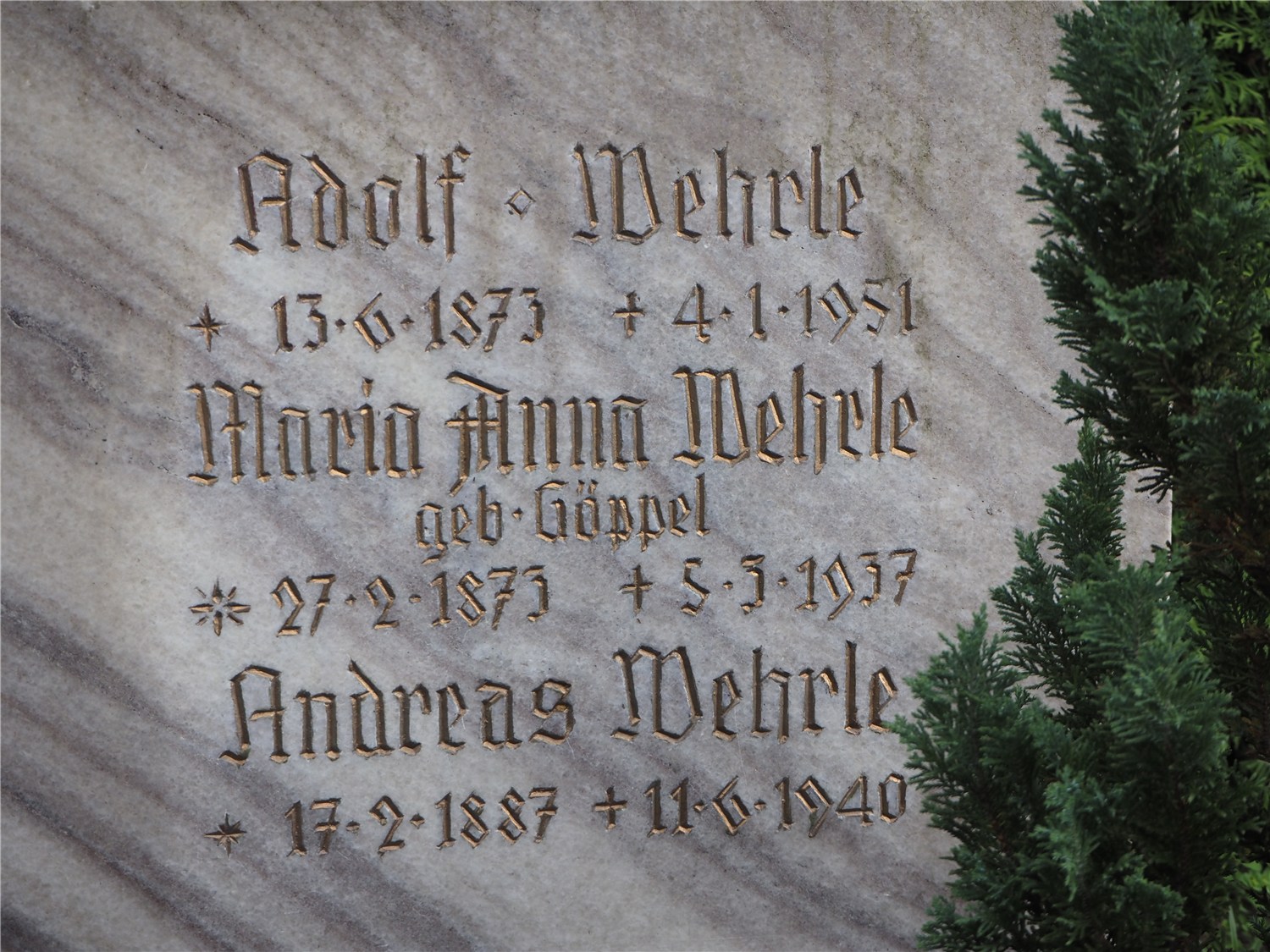 Auch auf dem Grabstein der Familie Wehrle ist das gemeldete, aber gefälschte Sterbedatum von Adreas Wehrle eingraviert: 11.06.1940.