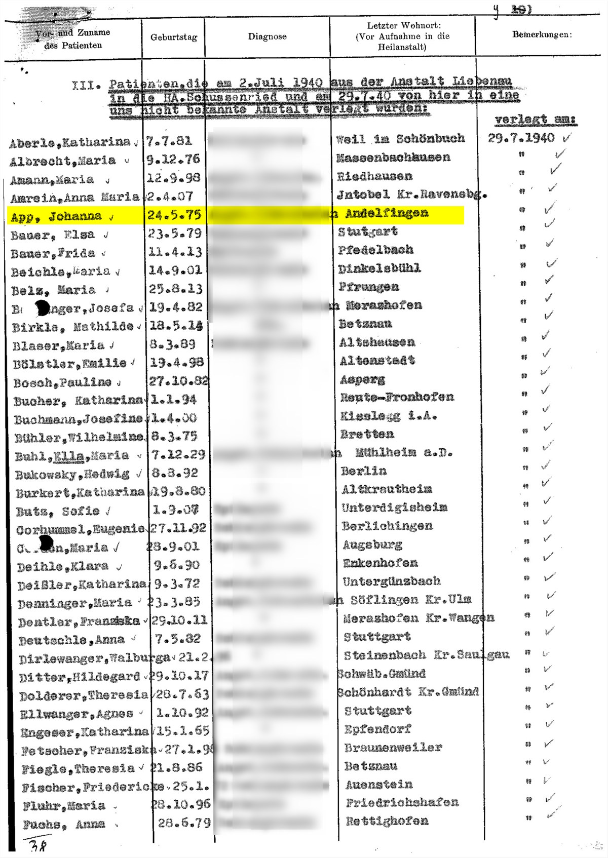Liste der Frauen, die „am 2. Juli 1940 aus der Anstalt Liebenau in die HA Schussenried verlegt“ und am 29. August 1940 nach Grafeneck deportiert wurden. (Sammlung Schussenried, Teil II. Aufstellung Nr. 1247, B).